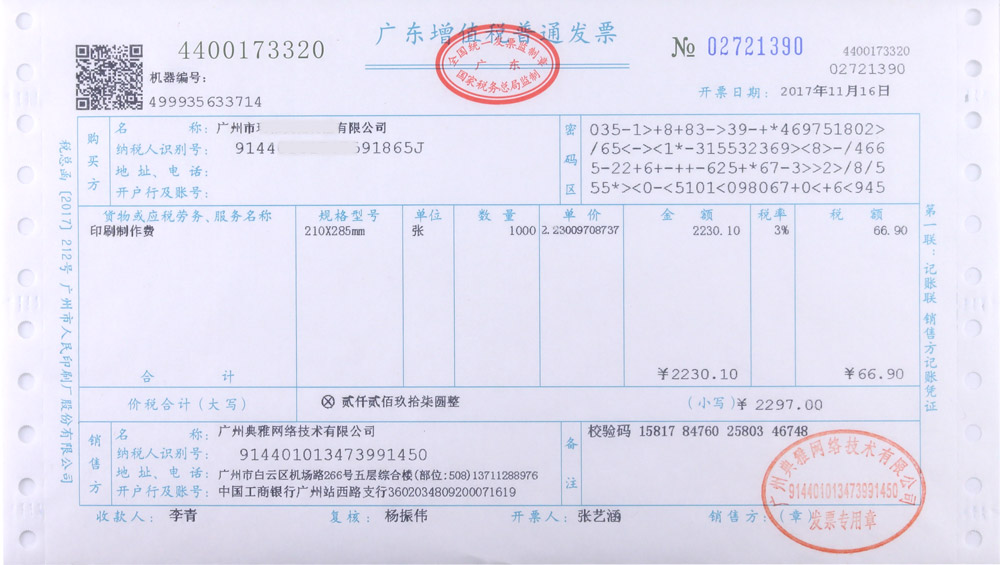 订印网提供正规机打普通增值税发票,开票项目默认为制作费。公司开票需正确填写单位全称、纳税人识别号、公司注册地址、电话、开户行及账号。